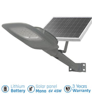 Equipped with SMD5050 LEDs producing 160 lm/W, a 45 W monocrystalline solar panel, and a 40,000 mAh LiFePO₄ battery, it ensures bright and consistent illumination throughout the night. The 70°×140° asymmetric optic provides uniform light distribution (6500 K), ideal for streets and pathways.